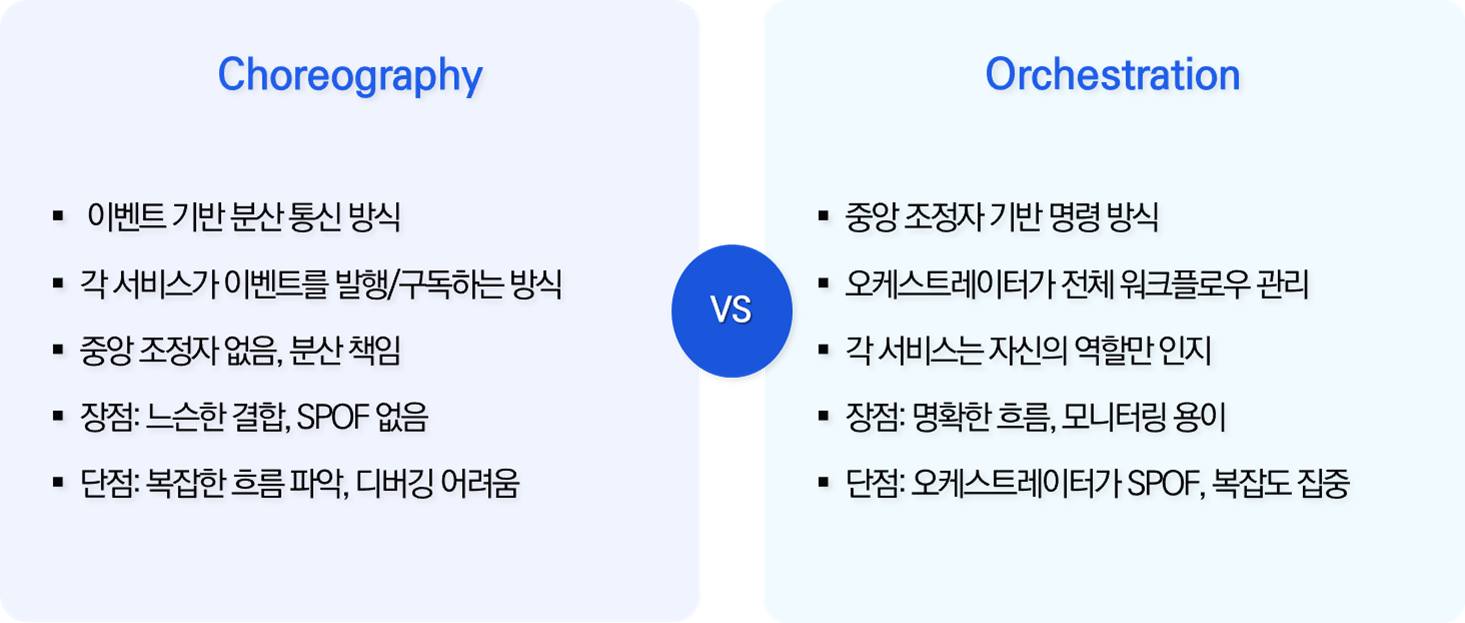 • Choreography vs Orchestration : 서비스 간 협조 방식-이벤트 기반 자율 흐름 vs 중앙 집중 제어