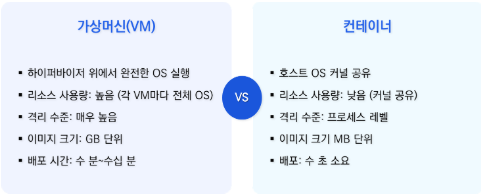 밀도(서버 당)낮음(수~수십 VM)높음(수백~수천 컨테이너)