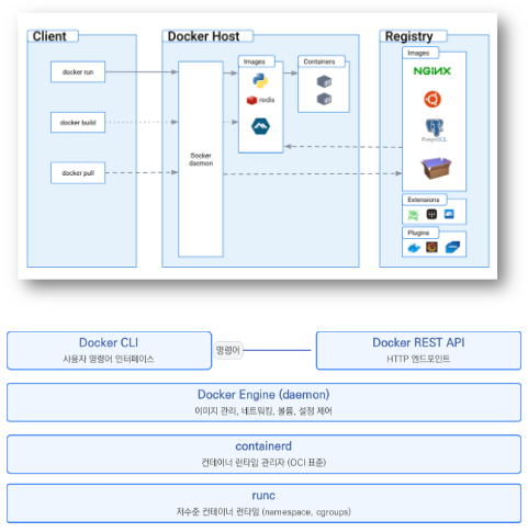 Docker는 컨테이너 기술을 대중화한 플랫폼입니다. 주요 구성 요소는 다음과 같습니다.