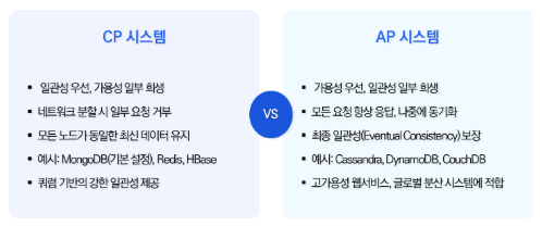 • CP 시스템 : 일관성 우선 – 모든 노드가 동일한 데이터 제공, 네트워크 분할 시 일부 요청 거부 (MongoDB)