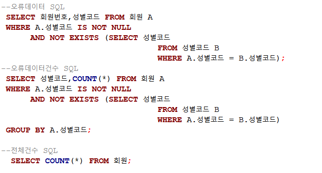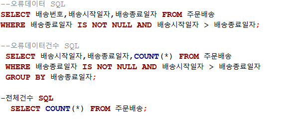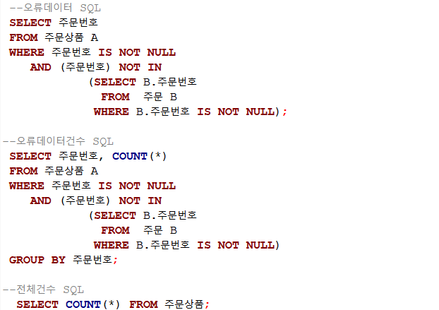 다음은 주문과 주문 상품 엔터티 간 참조 컬럼인 주문번호에 대해서 품질진단 쿼리입니다.