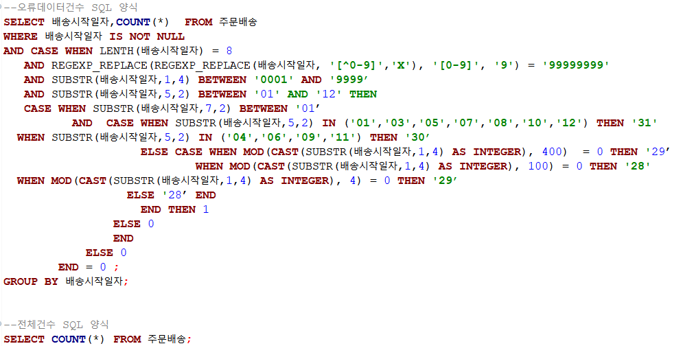 다섯 번째, “일자” 컬럼입니다. 일자에 대한 데이터 형식에 따라 도메인 표현식은 달라질 수 있습니다. 주문 배송의 배송 시작 일자가 VARCHAR2(8): YYYYMMDD 날짜 유형인 경우, 아래와 같이 품질 진단을 했습니다. 같은 날짜 유형이면, SQL 참고해서 컬럼만 변경 후 동일하게 진단할 수 있겠습니다.