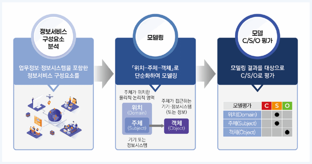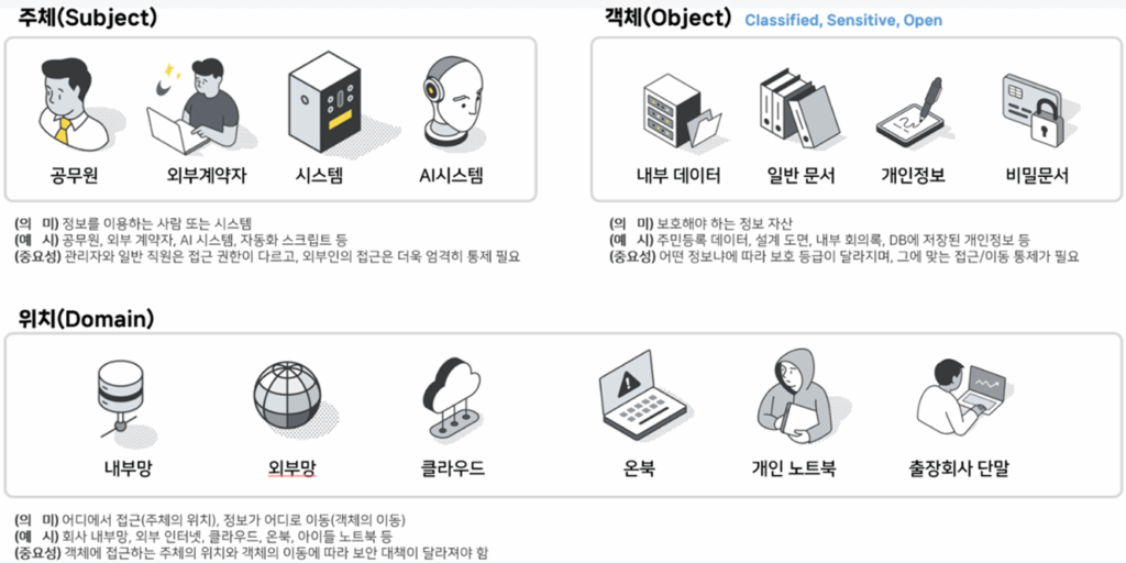 정보서비스 구성 환경은 위치(Domain), 주체(Subject), 객체(Object) 세 가지 요소로 단순화되며, 각 요소에는 C(Critical)/S(Sensitive) /O(Ordinary) 보안 등급이 부여된다.