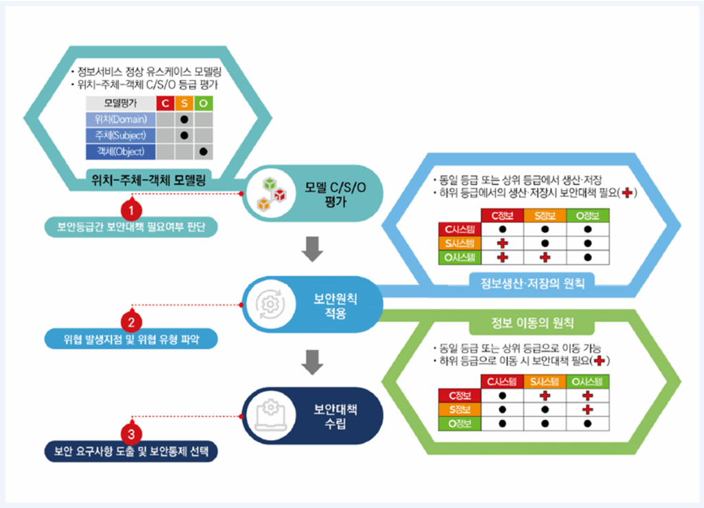 • 예시: 위치(S) – 주체(S) – 객체(O)와 같이 등급이 다를 경우, 주체, 객체, 주체와 객체 간 연계 구간 등 최소 3곳에 보안 대책 적용을 검토해야 한다.