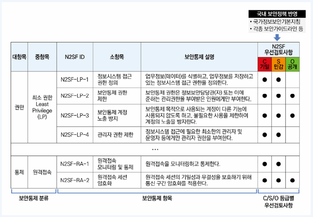 이러한 배경에 따라 새롭게 수립된 ‘국가 망 보안체계(N2SF)’는 신기술 활용 촉진과 국가 안보 유지라는 두 가지 목표를 동시에 충족시키기 위한 보안 프레임워크이다. N2SF는 업무 정보 및 시스템을 기밀(Classified), 민감(Sensitive), 공개(Open)와 같이 업무 중요도에 따라 분류하고, 등급별로 차등화된 보안 통제를 적용하도록 한다. 이를 통해 각급 기관은 자율성을 가지고 기관 특성에 맞는 보안 대책을 설계하고 이행할 수 있게 된다.