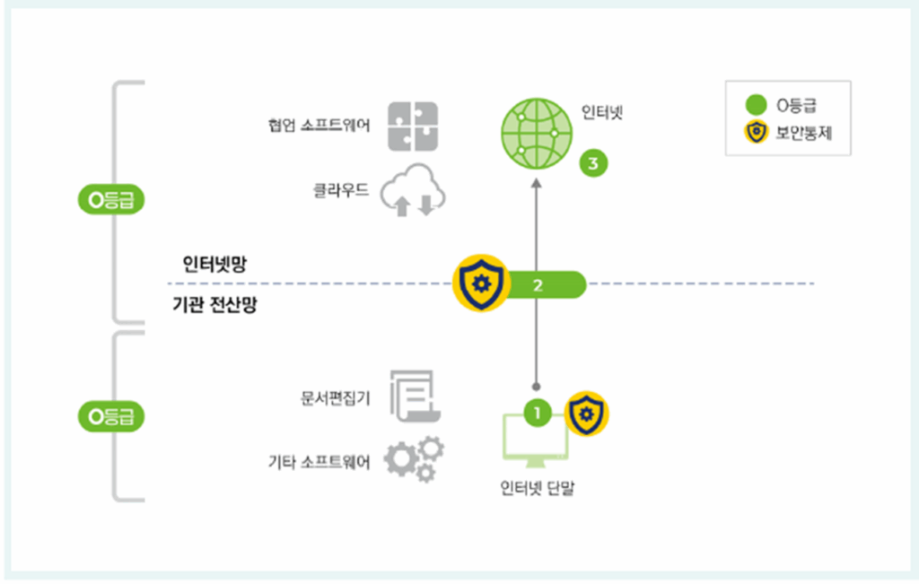 O등급 이용자 단말(인터넷 단말)이 업무 활용성 제고를 위한 인터넷 서비스를 활용하기 위해서는 단말 및 사용자 인증 후 보안통제가 적용되어야 한다. O등급 이용자 단말(인터넷 단말)은 인터넷 서비스 이용시 이용자·단말에 대한 연계체계 인증 후 인터넷 서비스 접속이 가능하다.