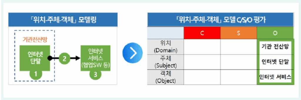 이 “위치-주체-객체” 모델링을 통해 해당 정보서비스 환경이 동일한 보안 등급으로 구성되는지, 아니면 서로 다른 보안 등급의 요소가 혼용되는지를 판단할 수 있다.
