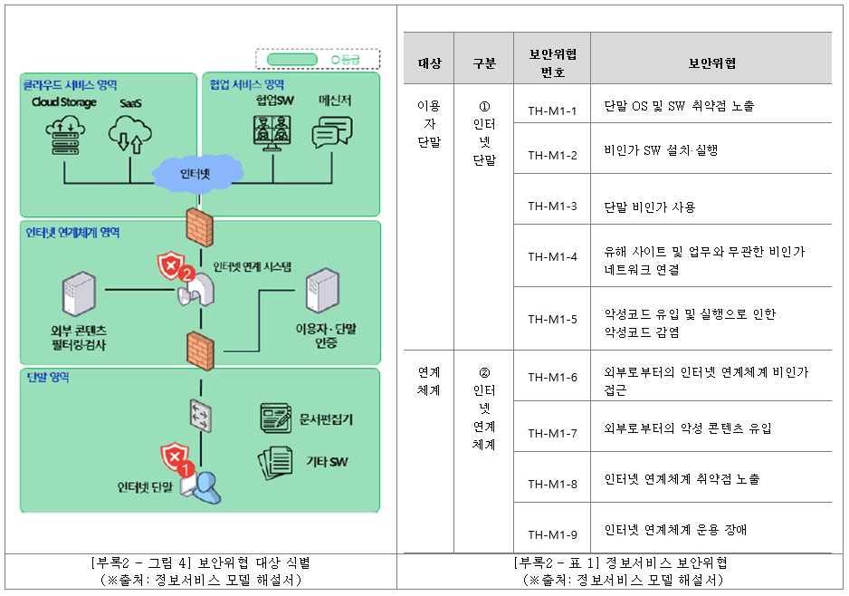 본 정보서비스 모델은 이용자 단말(①인터넷 단말), 인터넷 서비스 접근 제어를 위한 ②인터넷 연계체계, 업무 활용성 제고를 위한 인터넷 서비스(클라우드 서비스, 협업 서비스 등)로 구성되며, [부록2 – 표 1]과 같이 정보서비스 모델 구성 대상별 보안 위협을 식별한다.