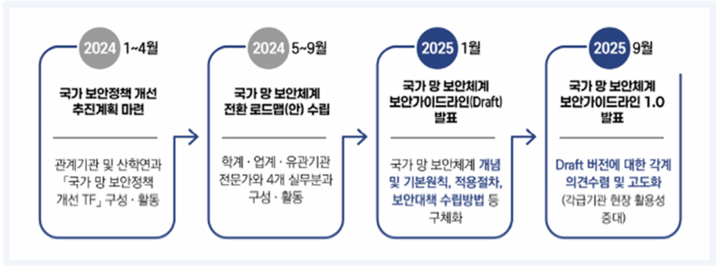 [그림 1] 망 분리 정책 개선 추진 경과 (※출처: 국가 망 보안체계 보안 가이드라인 1.0)