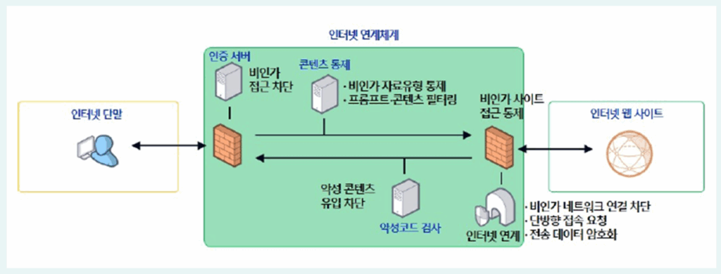 인터넷 단말은 인터넷 연계체계를 통해 인터넷(웹 서비스)에 단방향 접속을 할 수 있으며 다음과 같은 보안 요구사항 및 보안통제 항목을 적용해야 한다.