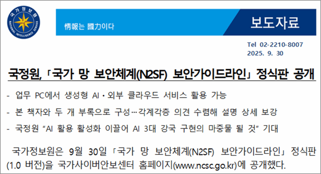 국정원 관계자는 “이번 N2SF 정책 시행이 공공 부문에 안전성을 제공하는 동시에 AI 도입 및 활용을 활성화하는 계기가 되어, AI 강국 구현의 밑거름이 될 것으로 기대한다”고 밝혔습니다. 또한 “앞으로도 국가 안보, 민생 안정, 그리고 AI 3대 강국 도약을 위한 맞춤형 사이버 안보 정책을 선제적으로 준비하겠다”고 강조했다.