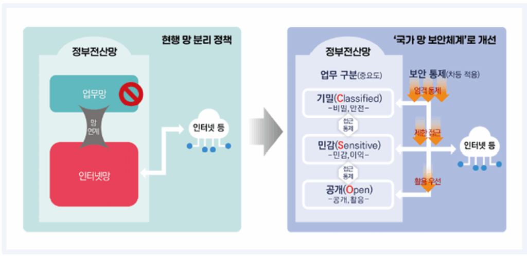 그러나 코로나19 이후 재택근무, 클라우드, 생성형 AI 등 새로운 IT 환경과 업무 효율성 요구가 커지면서 기존 망 분리 정책의 유연성 문제가 제기되었다. 이에 따라 보안성을 유지하면서도 혁신과 효율성을 동시에 달성할 수 있는 새로운 정책적 해법 마련의 필요성이 대두되었다.