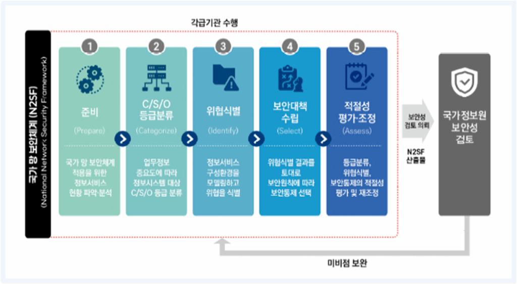 이와 같이 국가·공공기관은 정보화사업(정보서비스 신규 구축 및 기존 운영 중인 정보서비스에 대한 N2SF 적용 포함)을 추진할 때 국가 망 보안체계를 이용하여 표준화된 5단계 절차에 따라 기관이 자율적으로 위협을 식별하고 적절한 보안대책을 수립할 수 있다.