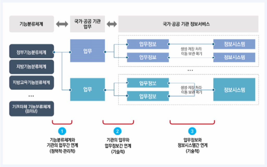 다음 그림은 ➊기능분류체계와 기관의 업무, ➋기관의 업무와 업무정보, ➌업무정보와 정보시스템에 이르는 연계성을 설명하고 있다.