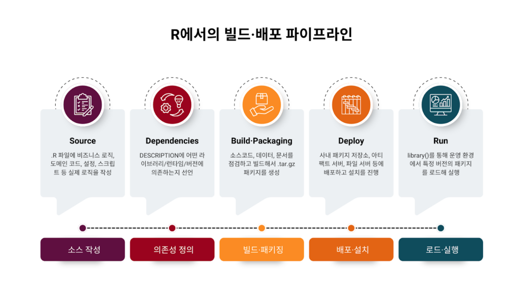 | [4]배포·설치 | 빌드된 패키지를 목표 환경 (서버/저장소/라이브러리 경로)에 배포·설치하는 단계 | R CMD INSTALL, 커스텀 스크립트 실행 |